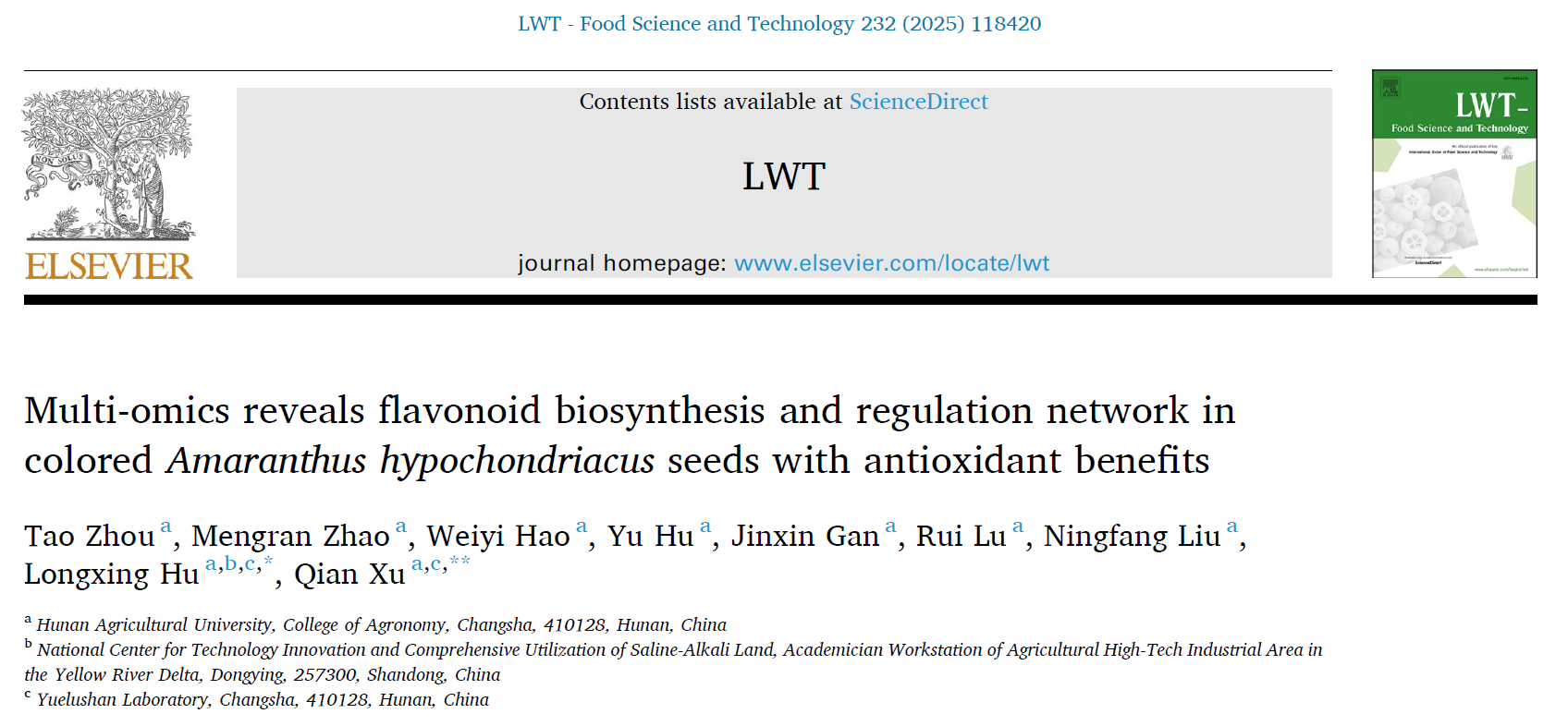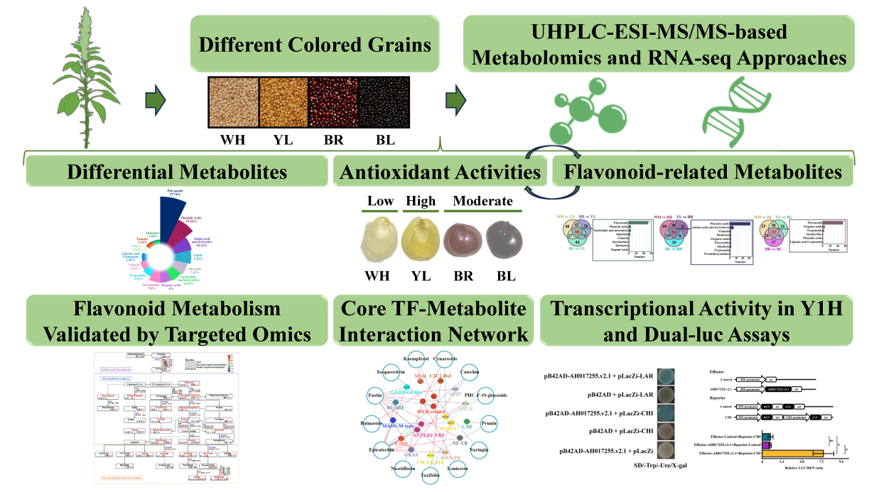 近日,beat365在线体育官网农学院/岳麓山实验室胡龙兴教授团队在中国科学院1 区 Top 期刊《LWT-Food Science and Technology》(影响因子 IF=6.6)发表了题为“Multi-omics reveals flavonoid biosynthesis and regulation network in colored Amaranthus hypochondriacus seeds with antioxidant benefits”的研究论文。团队通过联合组学分析,系统揭示了不同颜色籽粒苋种子的特征代谢物组成及分子调控网络,为籽粒苋品质改良提供了关键理论支撑。