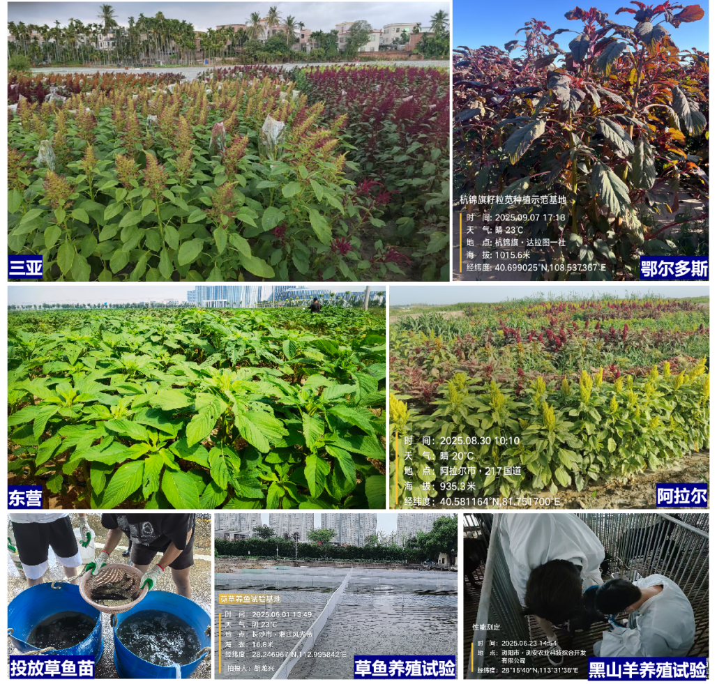 胡龙兴教授团队长期聚焦高产高蛋白饲草种质创新与开发利用。已收集保存禾本科、豆科、苋科等饲草资源近1万份,完成3000余份种质的系统评价,筛选出高产、高蛋白、耐盐碱的籽粒苋等优异种质。通过杂交育种并结合分子标记辅助选育技术成功培育5个饲草新品系。团队在三亚、东营、长沙建有育种基地,新品系已在新疆喀什、阿拉尔、内蒙古鄂尔多斯、湖南常德等多地规模化栽培示范。此外,基于创新的 “禾—苋”高效间作栽培模式,团队开发了混合青贮、草颗粒等草产品,并在湘东黑山羊、草鱼养殖中完成饲喂评价,成效显著,为我国饲草产业高质量发展提供了重要技术与种质支撑。