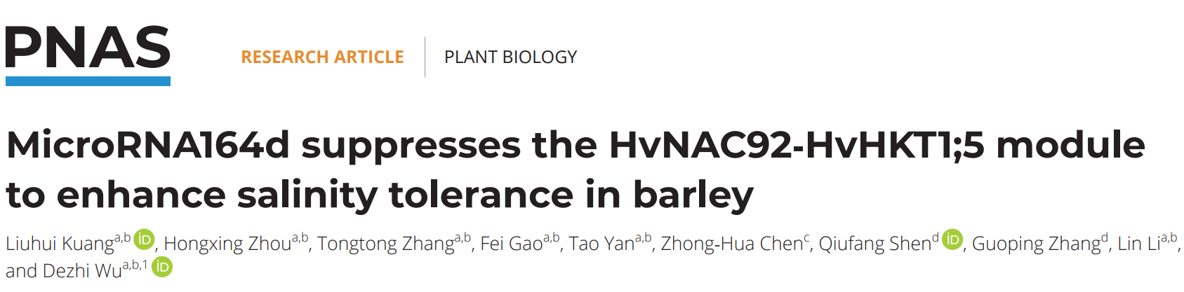 近日,beat365在线体育官网/岳麓山实验室吴德志团队在国际著名学术期刊PNAS在线发表题为“MicroRNA164d suppresses the HvNAC92-HvHKT1;5 module to enhance salinity tolerance in barley”的研究论文。该研究揭示了miR164d作为一个“分子刹车”精准调控HvNAC92-HvHKT1;5模块,实现耐盐作物大麦在盐胁迫下的“自救”模式,为阐明禾本科作物HKT1;5功能分化提供重要理论参考。