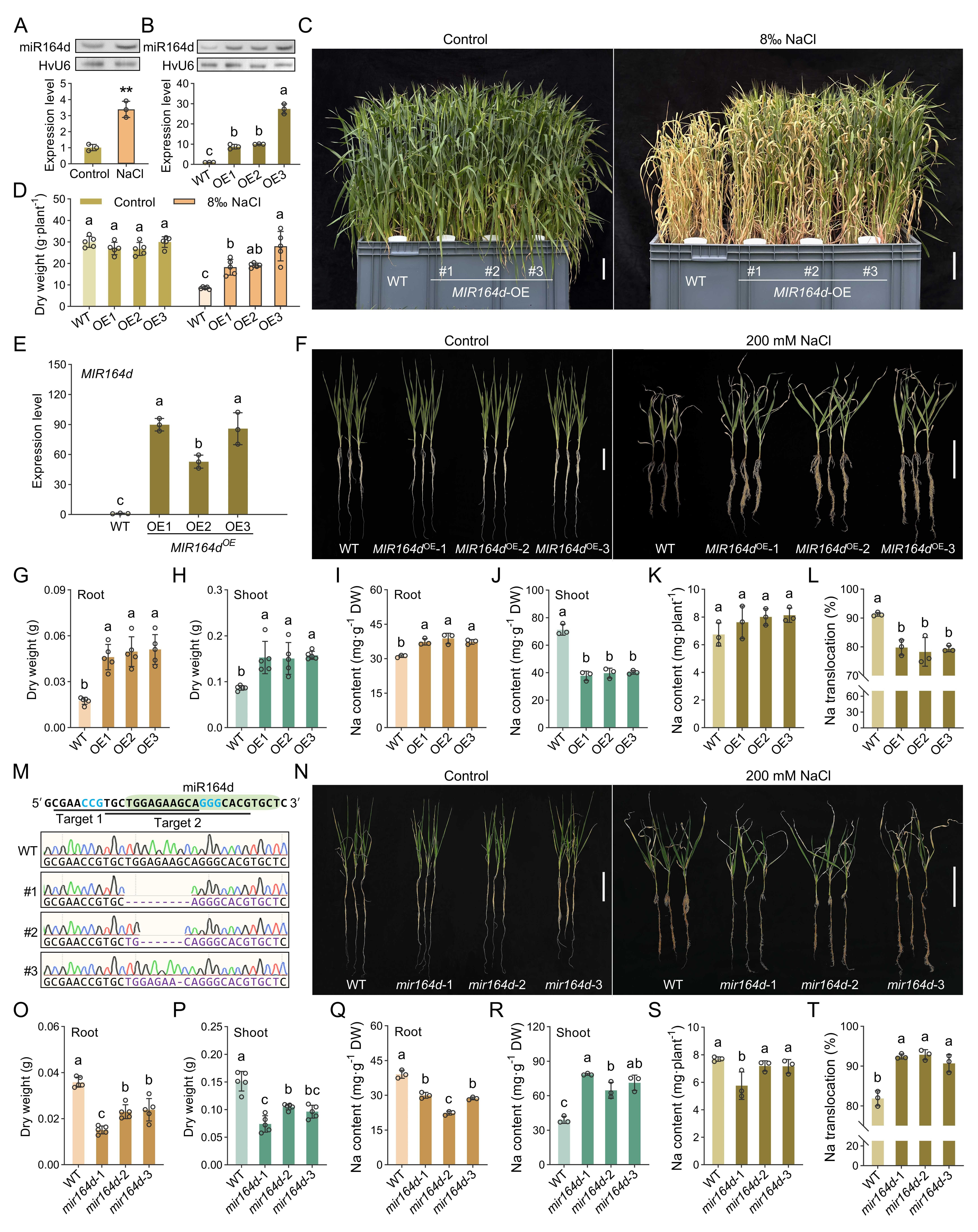 图3. miR164d-HvNAC92-HvHKT1;5模块精准调控大麦耐盐性