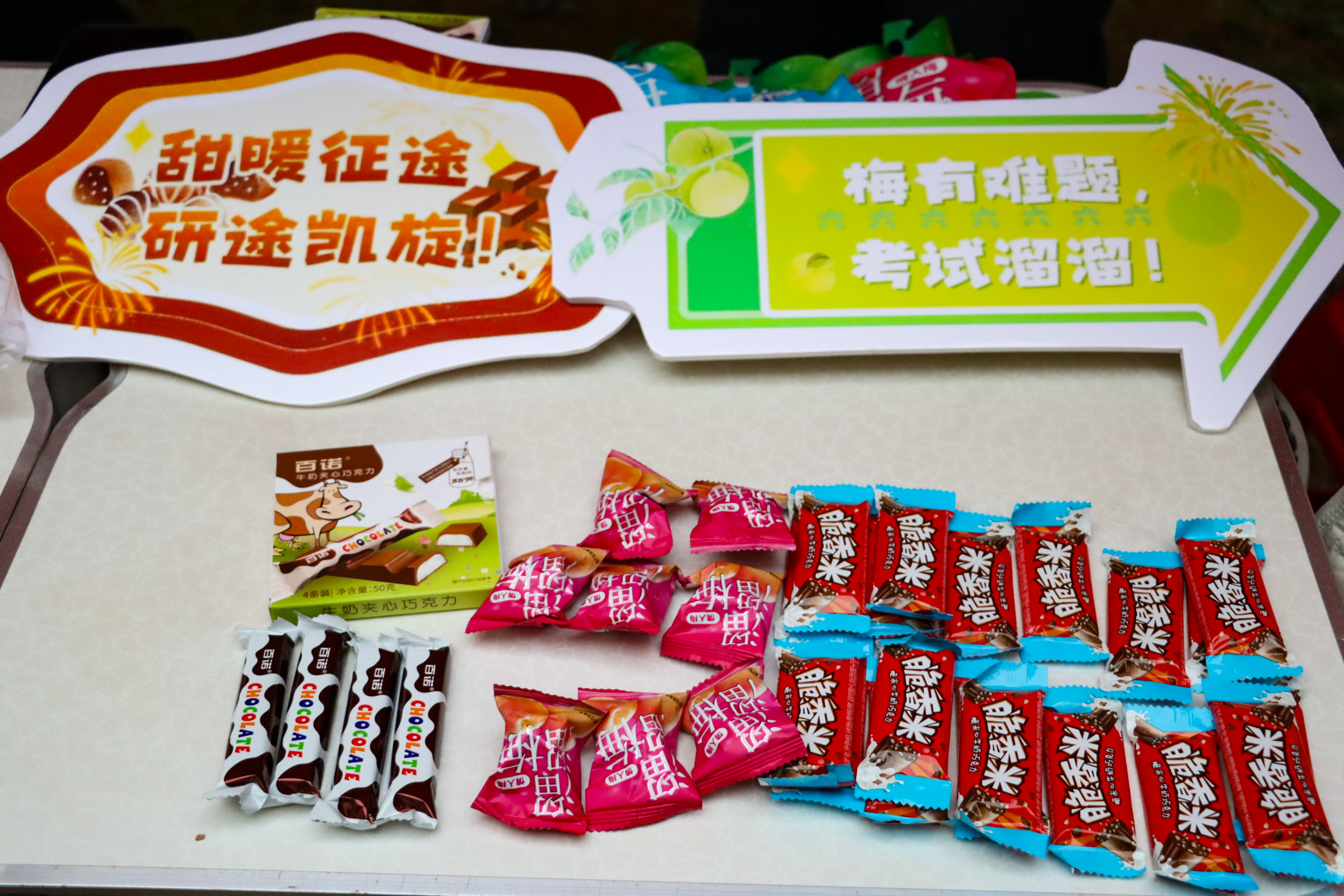 红色的帐篷在寒风中格外醒目,志愿者们忙碌的身影穿梭其间。精心准备的热饮驱散着冬日的凉意,香甜的糖果传递着甜蜜的期许,还有那些创意满满的应援牌——“梅有难题,考试溜溜”“甜暖征途,研途凯旋”,每一句都藏着农学院独有的巧思与心意。