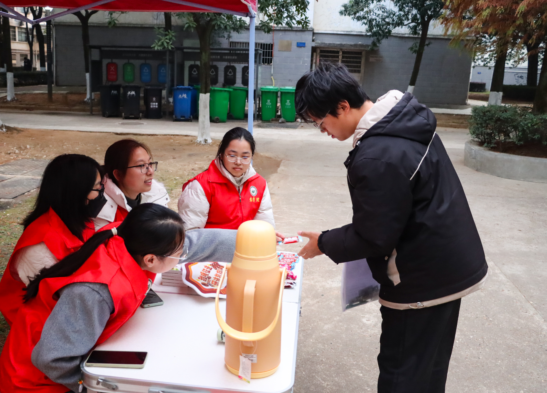 “学长加油!祝你一战成硕!”“学姐放宽心,你一定可以的!”志愿者们面带笑容,将热饮和糖果递到考研学子手中,用一声声亲切的鼓励,为他们缓解备考的紧张。接过这份温暖的学子们,脸上也漾起了轻松的笑意,一句句“谢谢”,是冬日里最动听的回响。
