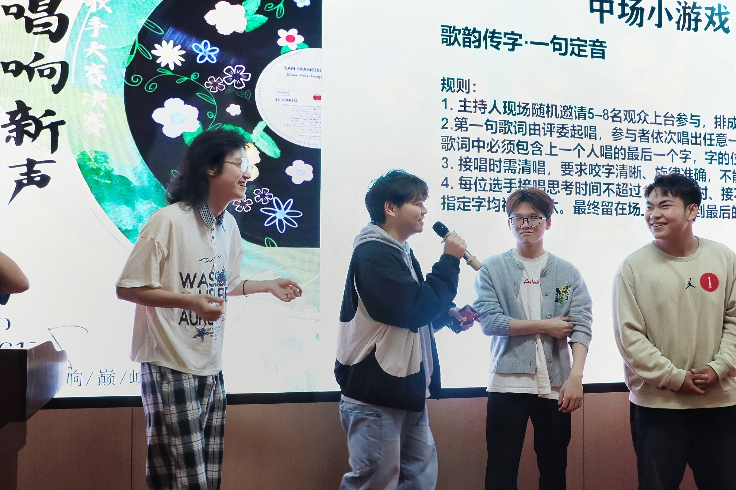 先是考验乐感的「旋律暗码・间奏识曲」,无声前奏一响,台下观众踊跃举手抢答,声声应答、阵阵欢呼将气氛推向小高潮。紧随其后的「歌韵传字・一句定音」更是点燃全场热情,随机邀请观众上台接力接唱,欢声笑语不断,全员沉浸其中,彻底盘活整场氛围,用满满乐趣与惊喜奏响青春乐声。