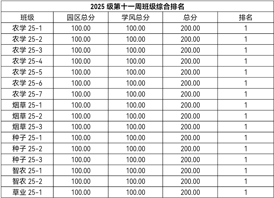 第十一周各年级均表现优秀,卫生情况良好,希望继续保持,同时也希望各年级保持优良作风,切实加强学院园区建设,共创美丽校园。