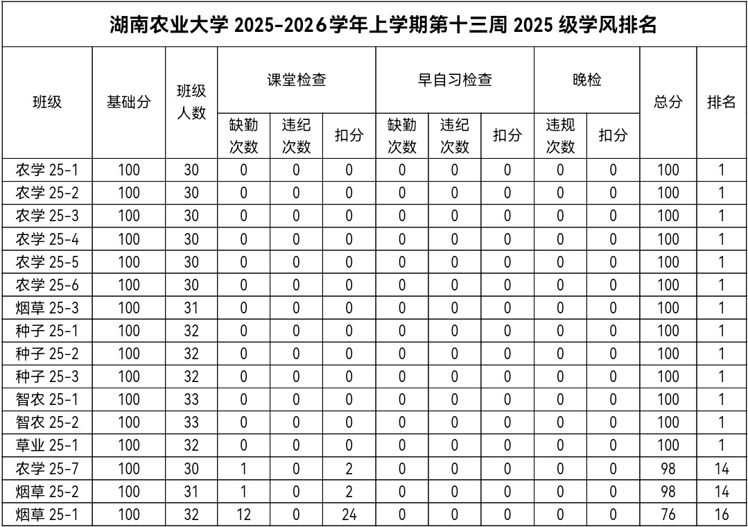 第十三周各年级均表现优秀,卫生情况良好,希望继续保持,同时也希望各年级保持优良作风,切实加强学院园区建设,共创美丽校园。