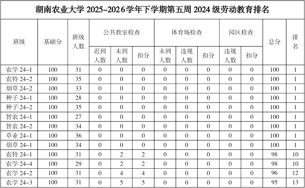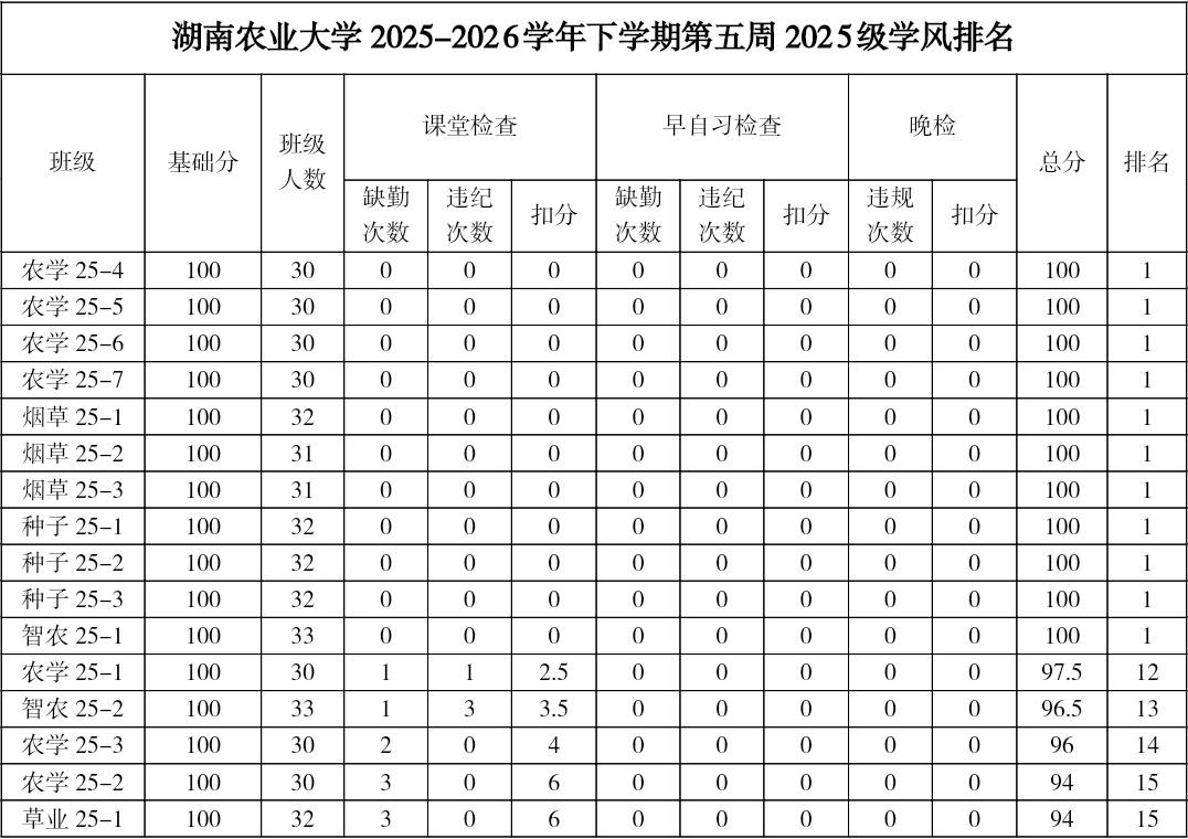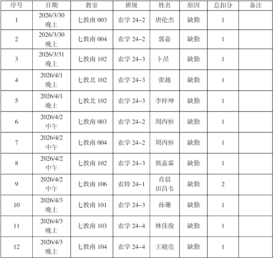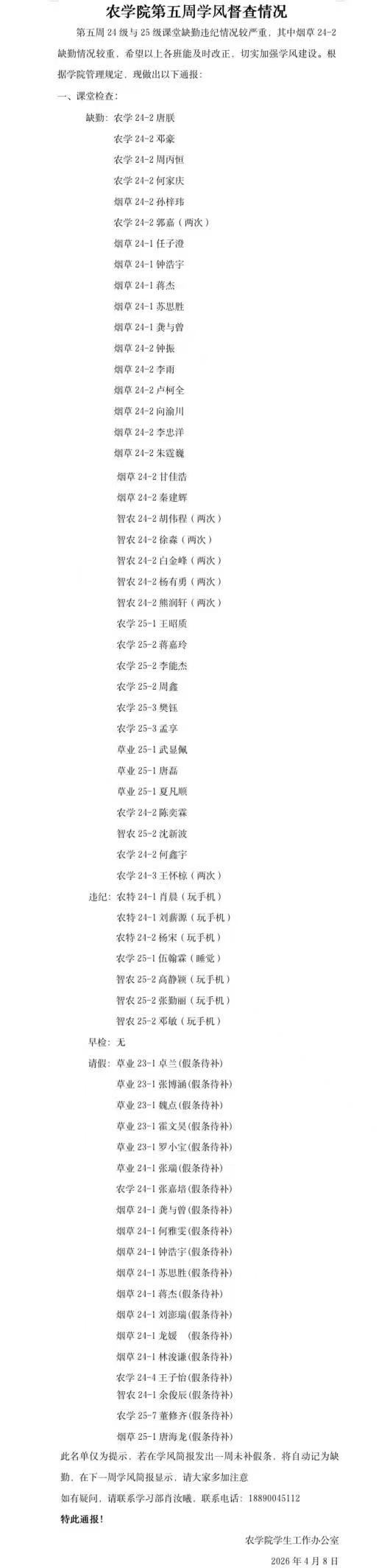 第五周24级与25级课堂缺勤违纪情况较严重,其中烟草24-2缺勤情况较重,希望以上各班能及时改正,切实加强学风建设。