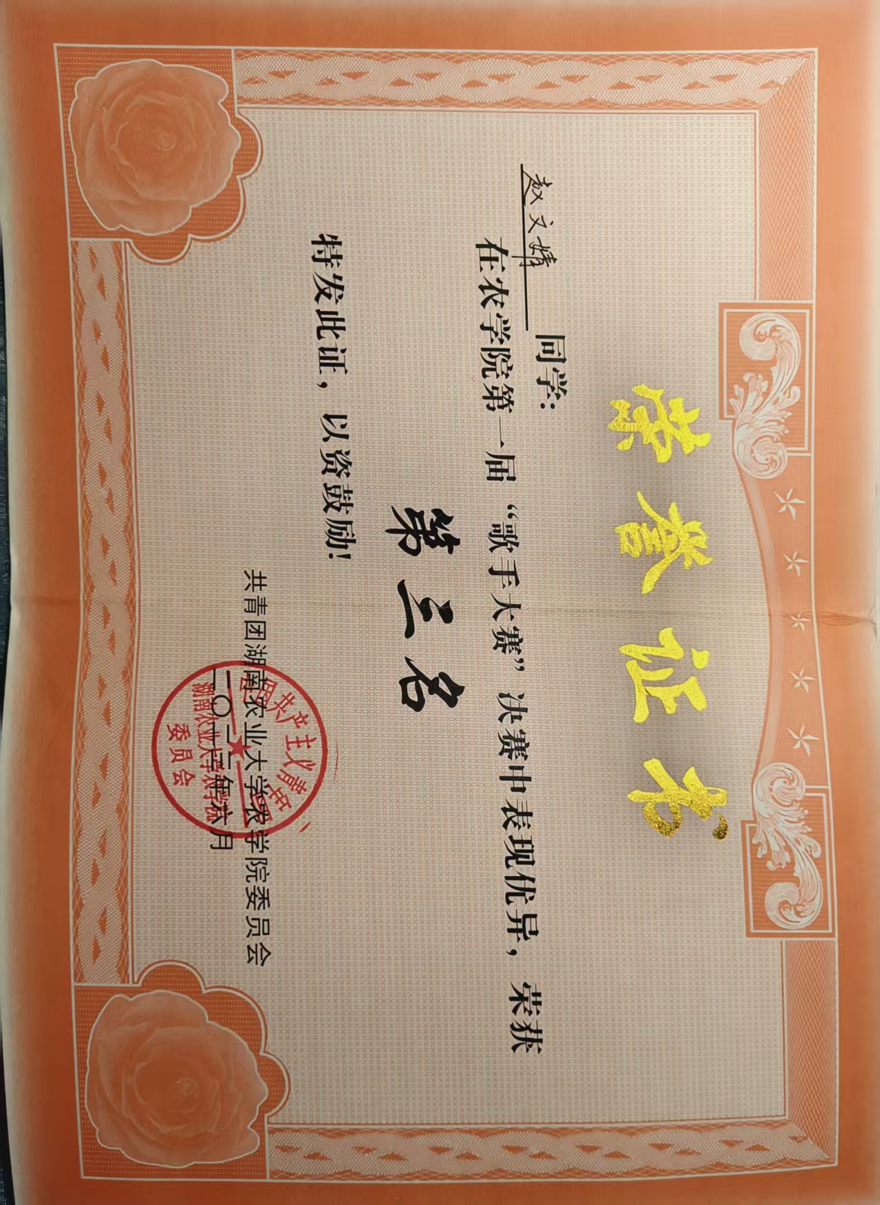 赵文婧,女,就读于2022级烟草2班。2022年加入农学院团委学生会设计制作部和农学院声乐队,后任声乐队技术指导、声乐协会技术部部长。曾获农学院歌手大赛冠军、校园十佳歌手前五名,多次担任比赛评委及帮唱嘉宾。