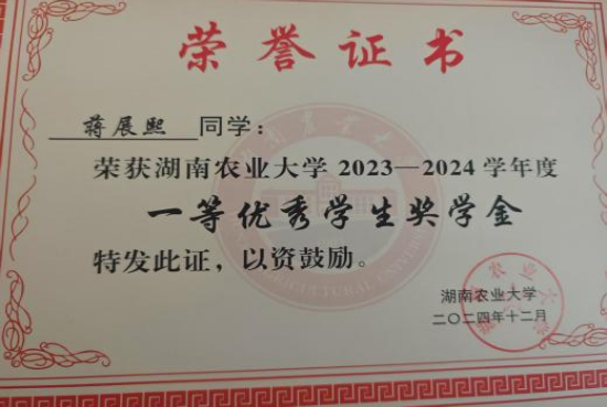 学业上,蒋展熙同学平均绩点3.89,荣获国家奖学金、国家励志奖学金,校一等优秀学生奖学金及农学院“十佳学习”之星,连续三年获评beat365在线体育官网三好学生标兵。