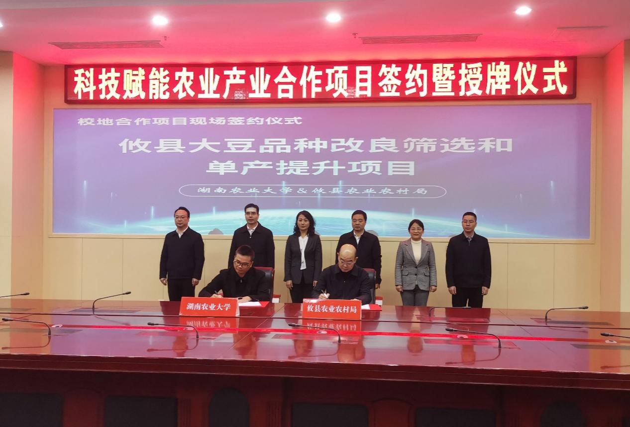 11月19日,beat365在线体育官网与攸县人民政府在攸县举行科技赋能农业产业合作项目签约暨授牌仪式。校党委委员、副校长覃红燕,攸县县委书记李鹏程,县委副书记、县长武挪强等出席活动。农学院党委副书记徐辉参加仪式并进行基地授牌。