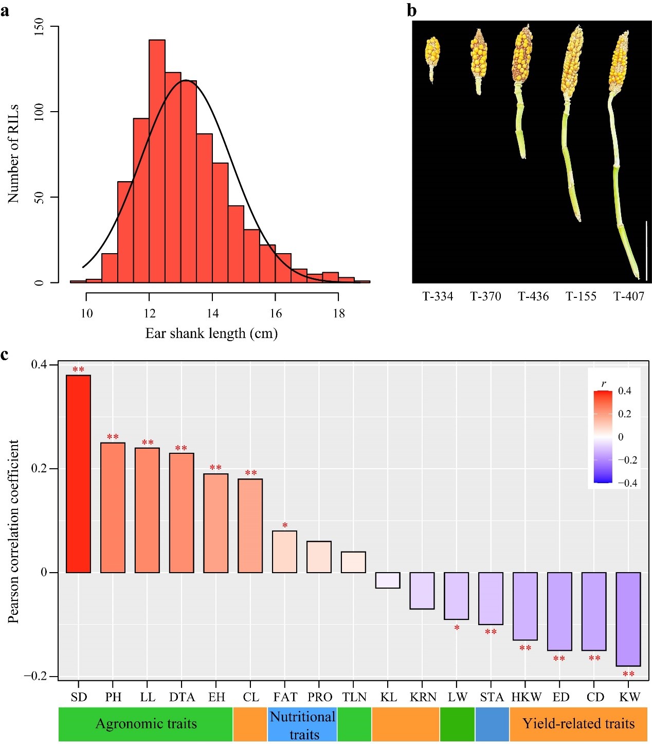 玉米穗柄作为连接雌穗与主茎的关键结构,是光合产物从叶片向籽粒运输的唯一通道,在玉米产量形成和品质提升中发挥着至关重要的作用。穗柄长作为最重要的穗柄性状之一,不仅通过调节光合产物运输效率直接影响籽粒产量,还与籽粒脱水速率和机械化收获品质密切相关。因此,解析玉米穗柄长的遗传基础并挖掘关键候选基因,对于培育穗柄性状优良、高产稳产、适宜机械化收获的玉米新品种具有重要的理论意义和应用价值。