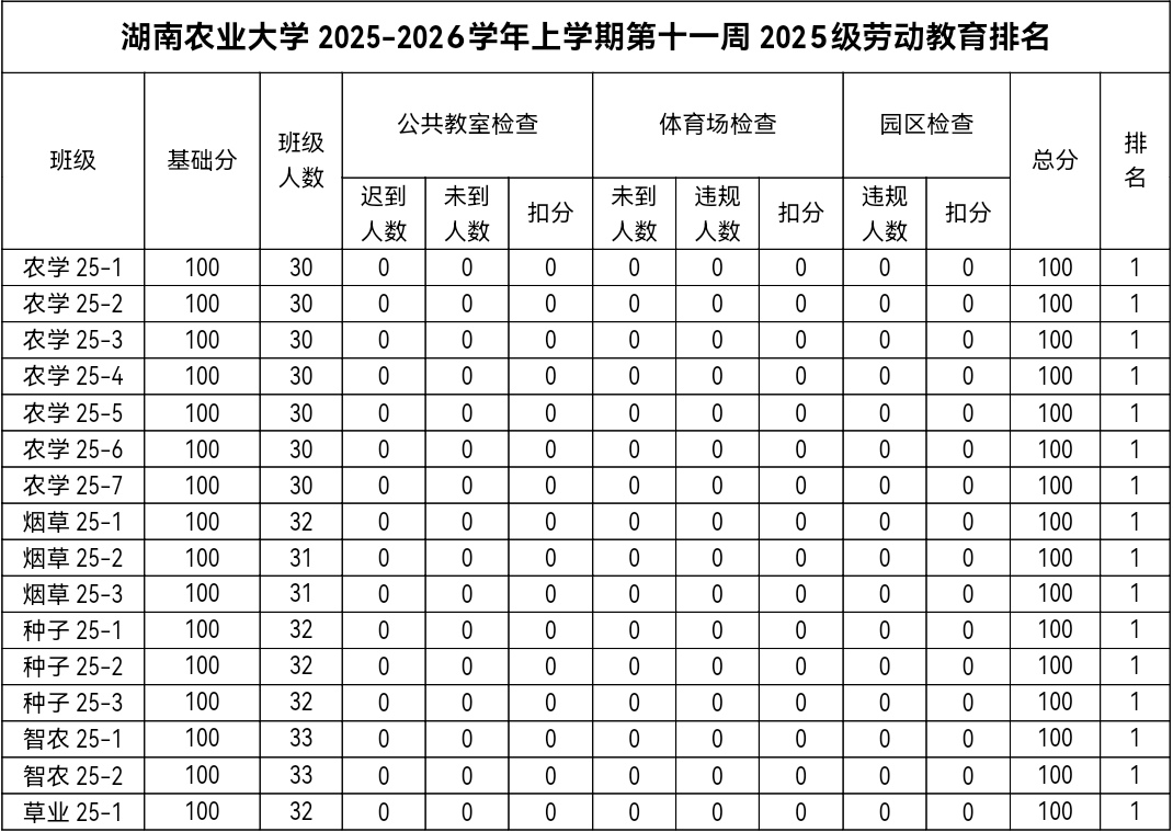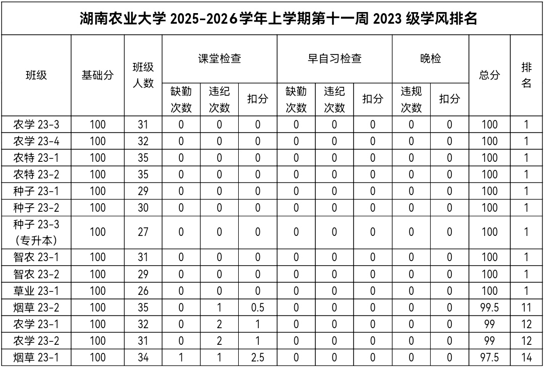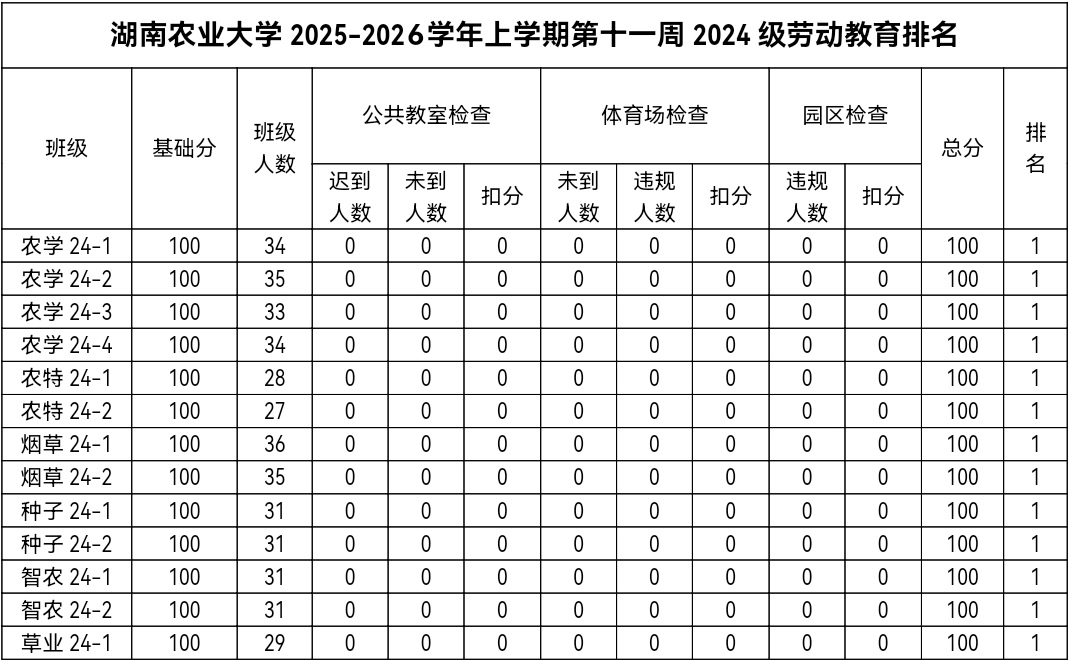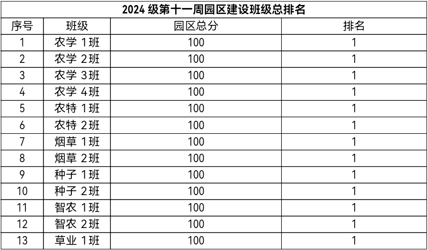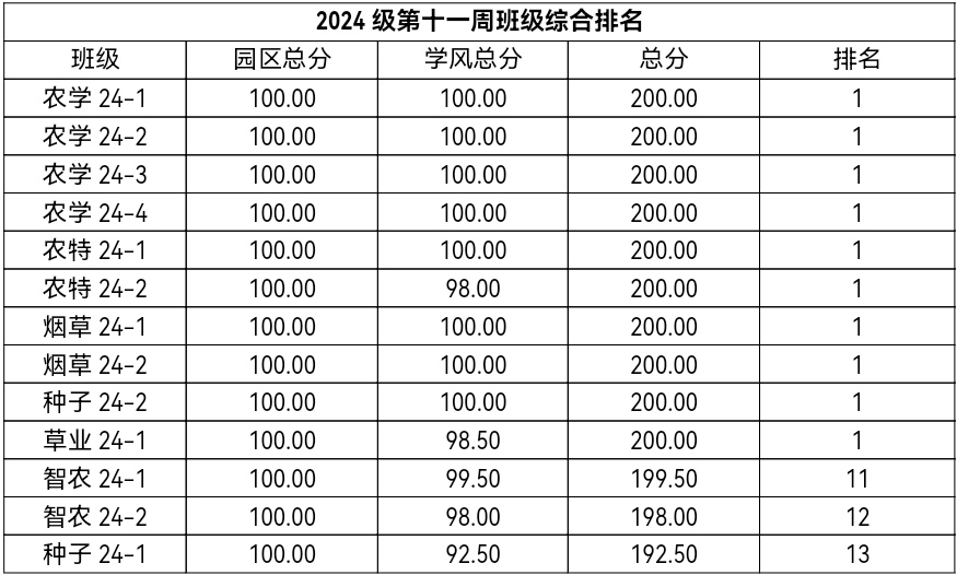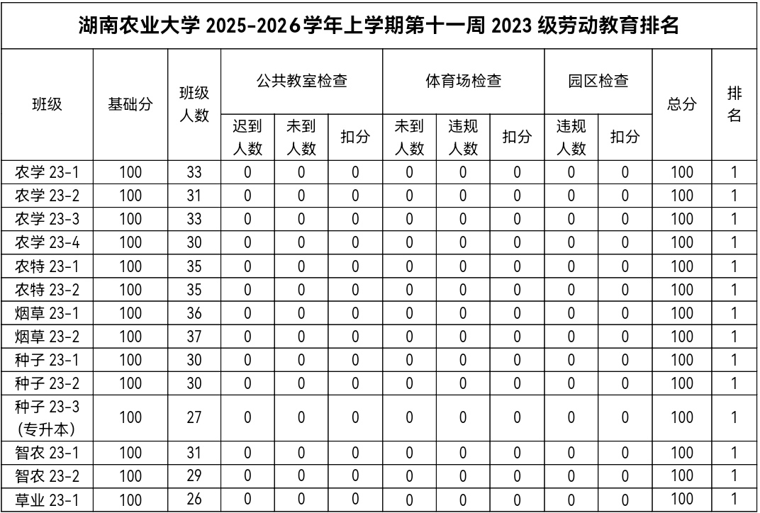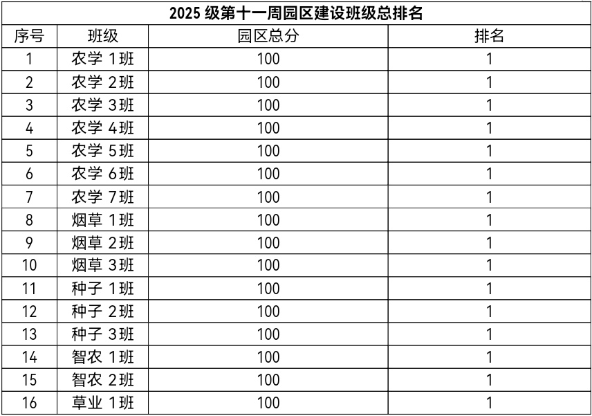 第十一周各年级均表现优秀,卫生情况良好,希望继续保持,同时也希望各年级保持优良作风,切实加强学院园区建设,共创美丽校园。