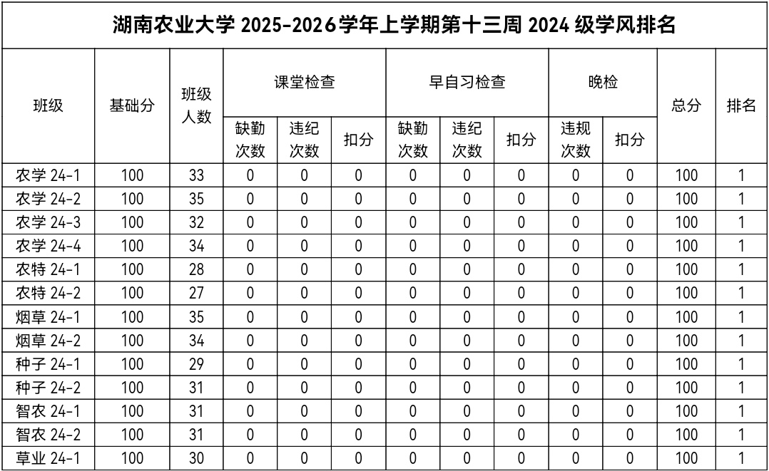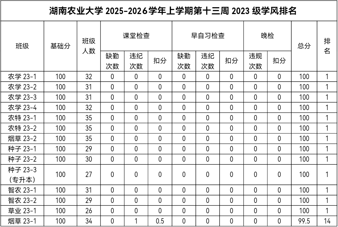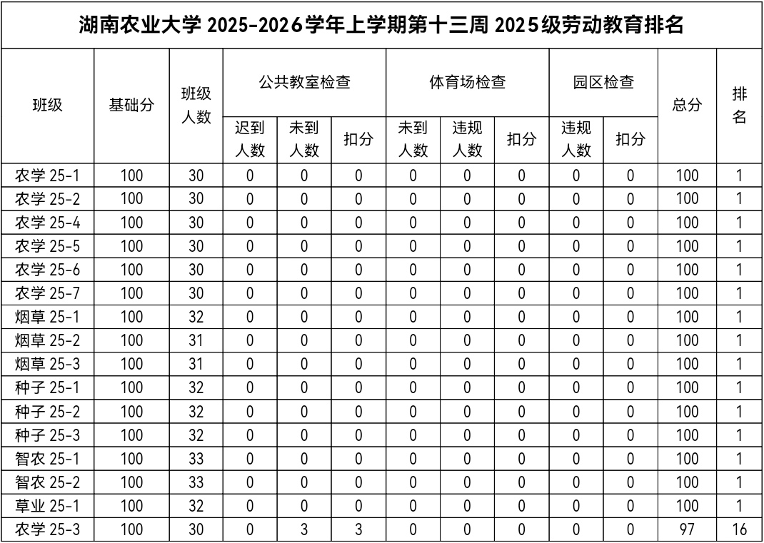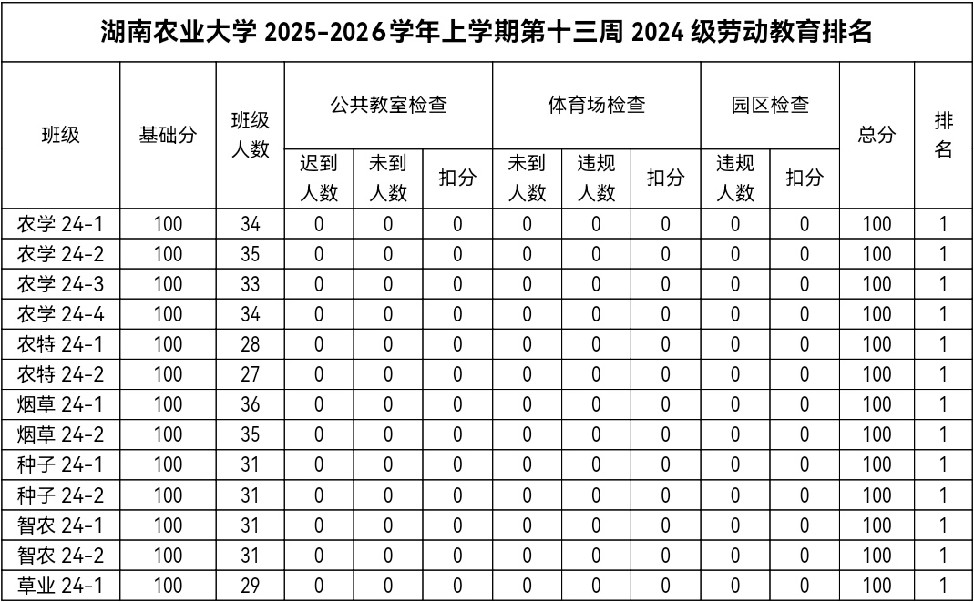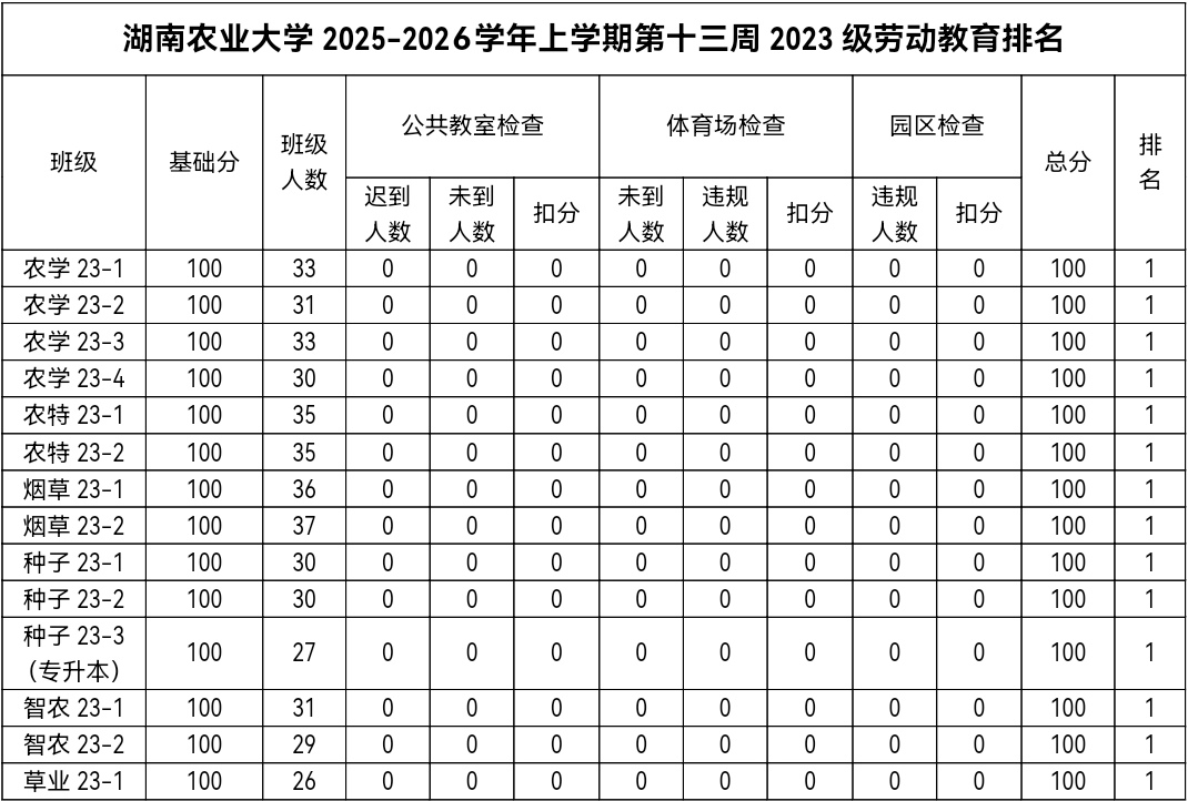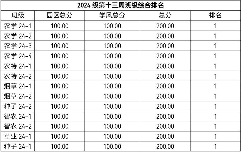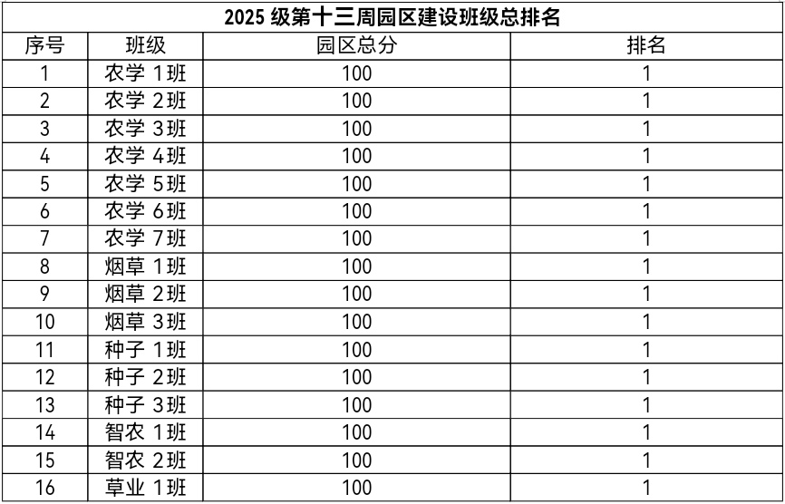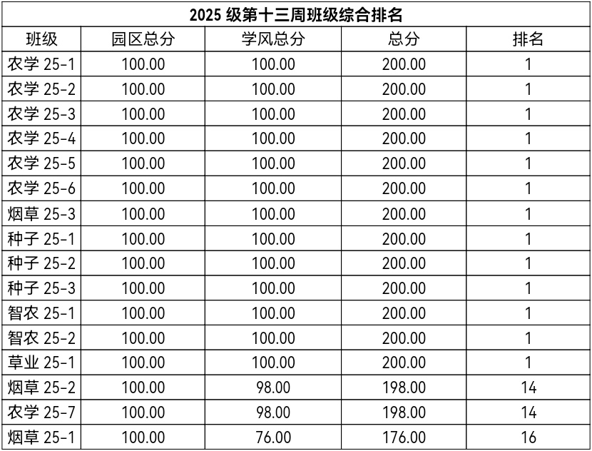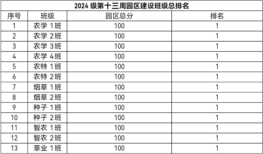 第十三周各年级均表现优秀,卫生情况良好,希望继续保持,同时也希望各年级保持优良作风,切实加强学院园区建设,共创美丽校园。