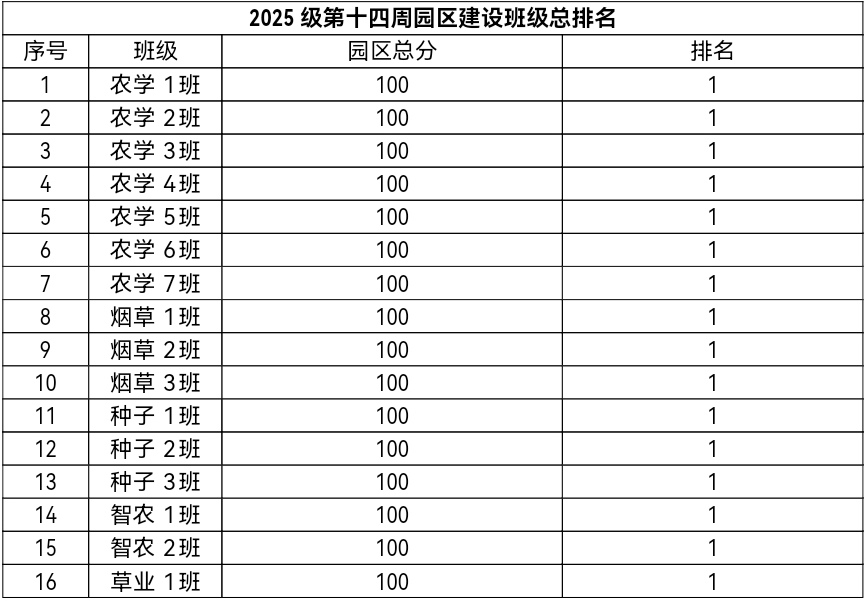 第十四周各年级均表现优秀,卫生情况良好,希望继续保持,同时也希望各年级保持优良作风,切实加强学院园区建设,共创美丽校园。