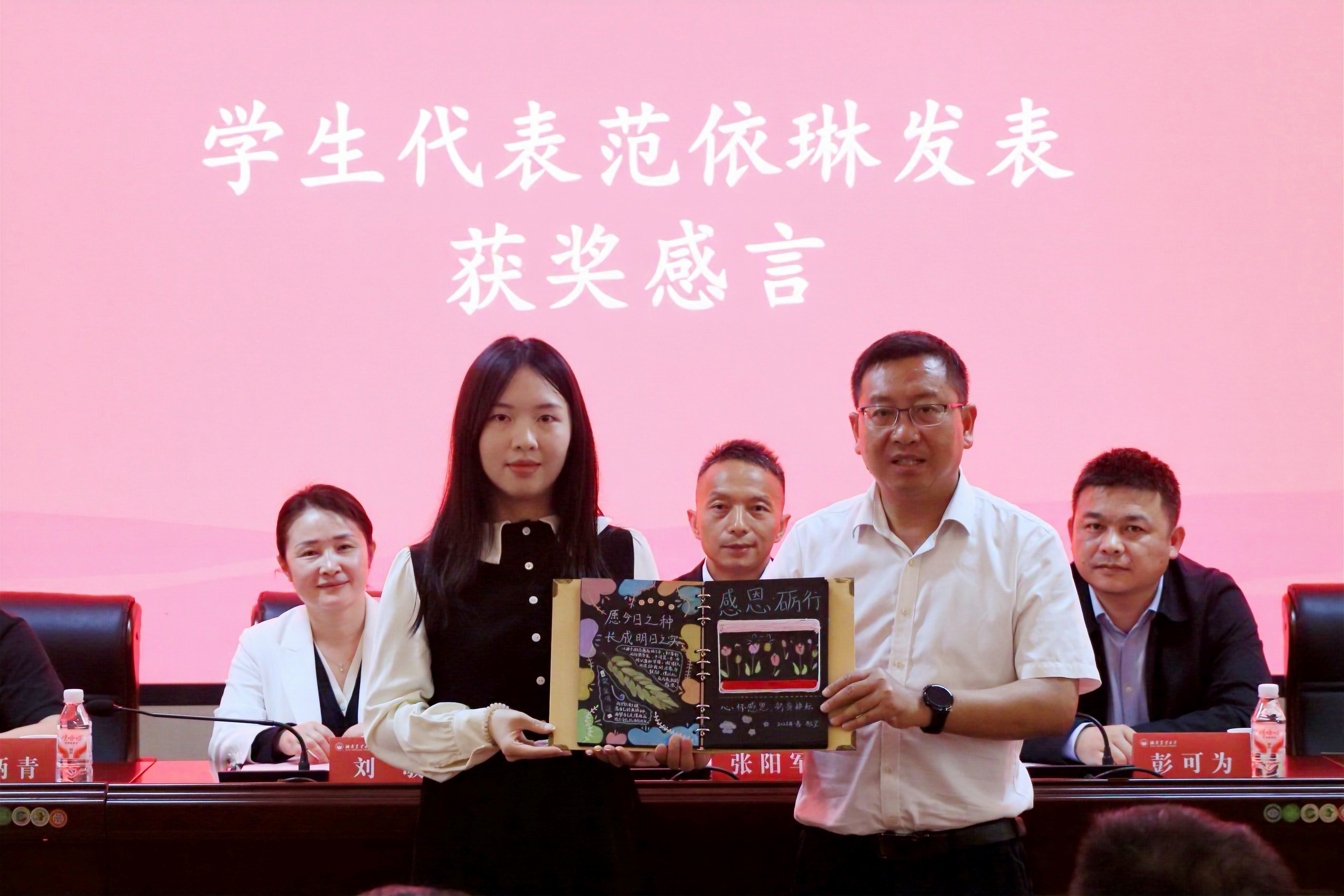 获奖教师代表叶能辉分享了自己的育人理念:通过教一个学生,带动一个家庭,辐射一个乡村。他表示,将继续在教学岗位及学术领域踔厉奋发、砥砺前行。获奖学生代表范依琳讲述自身奋斗经历,表示将坚定学农爱农、服务三农的理想信念,勤学笃行、勇攀科研高峰,把专业所学融入强国兴农事业。