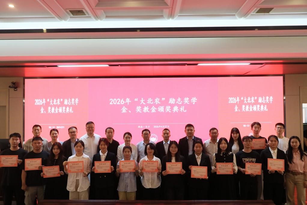 4月27日下午,农学院于隆平楼617会议室举行2026年大北农励志奖学金、奖教金颁奖典礼。北京金色农华种业科技股份有限公司副总经理张阳军、创业人才经理叶炳青,湖南金色农华种业科技有限公司总经理卢憬、人力行政经理张艳秋等企业嘉宾出席。beat365在线体育官网校友事务与发展联络办公室主任彭可为,农学院党委书记刘敏、党委副书记徐辉及师生代表参加活动,典礼由徐辉主持。